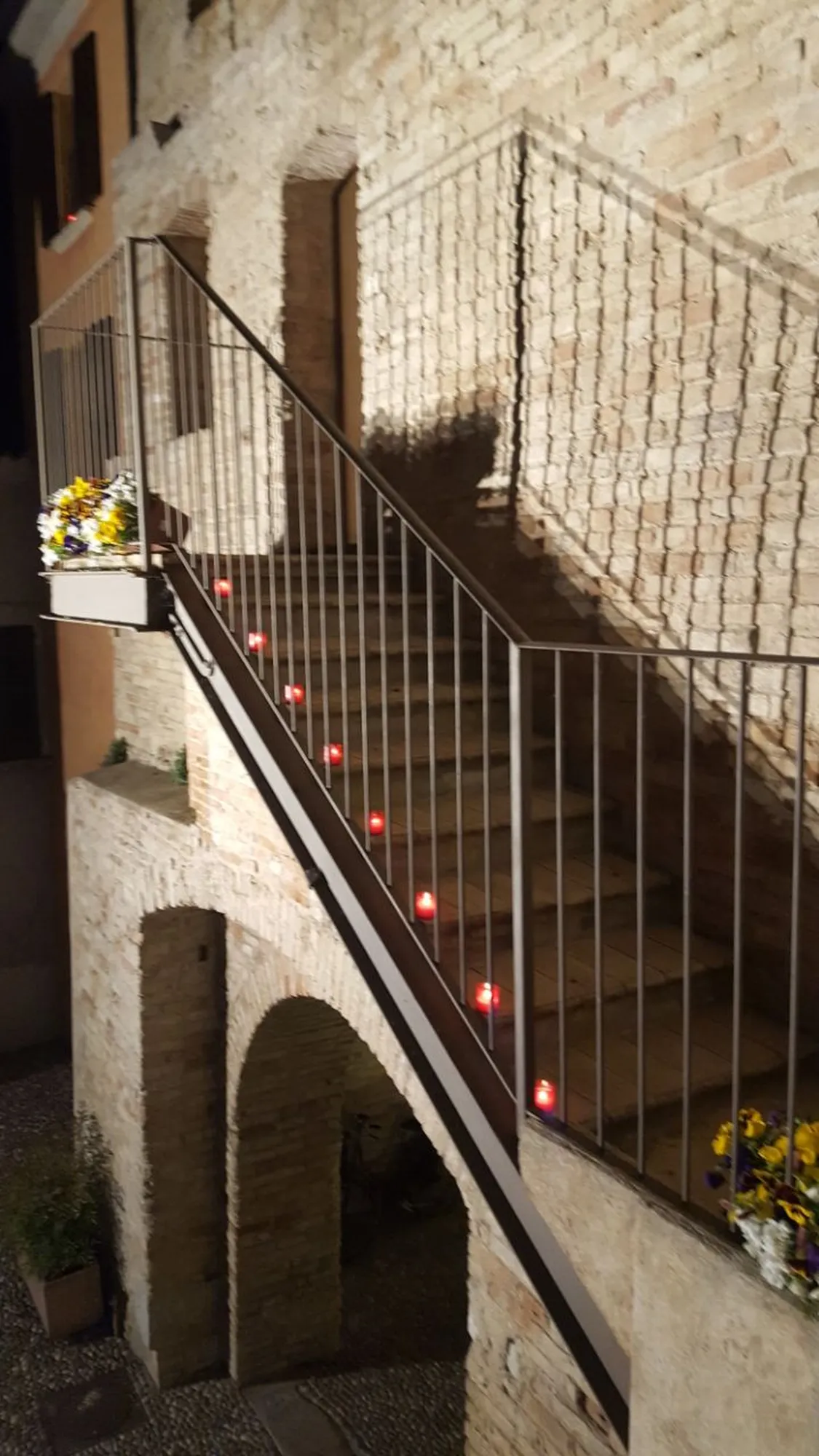 La facciata esterna del palazzo segue un andamento spezzato, per adattarsi al largo fossato che un tempo circondava l’intera corte. La facciata interna, invece, è caratterizzata da un elegante loggiato a vele.